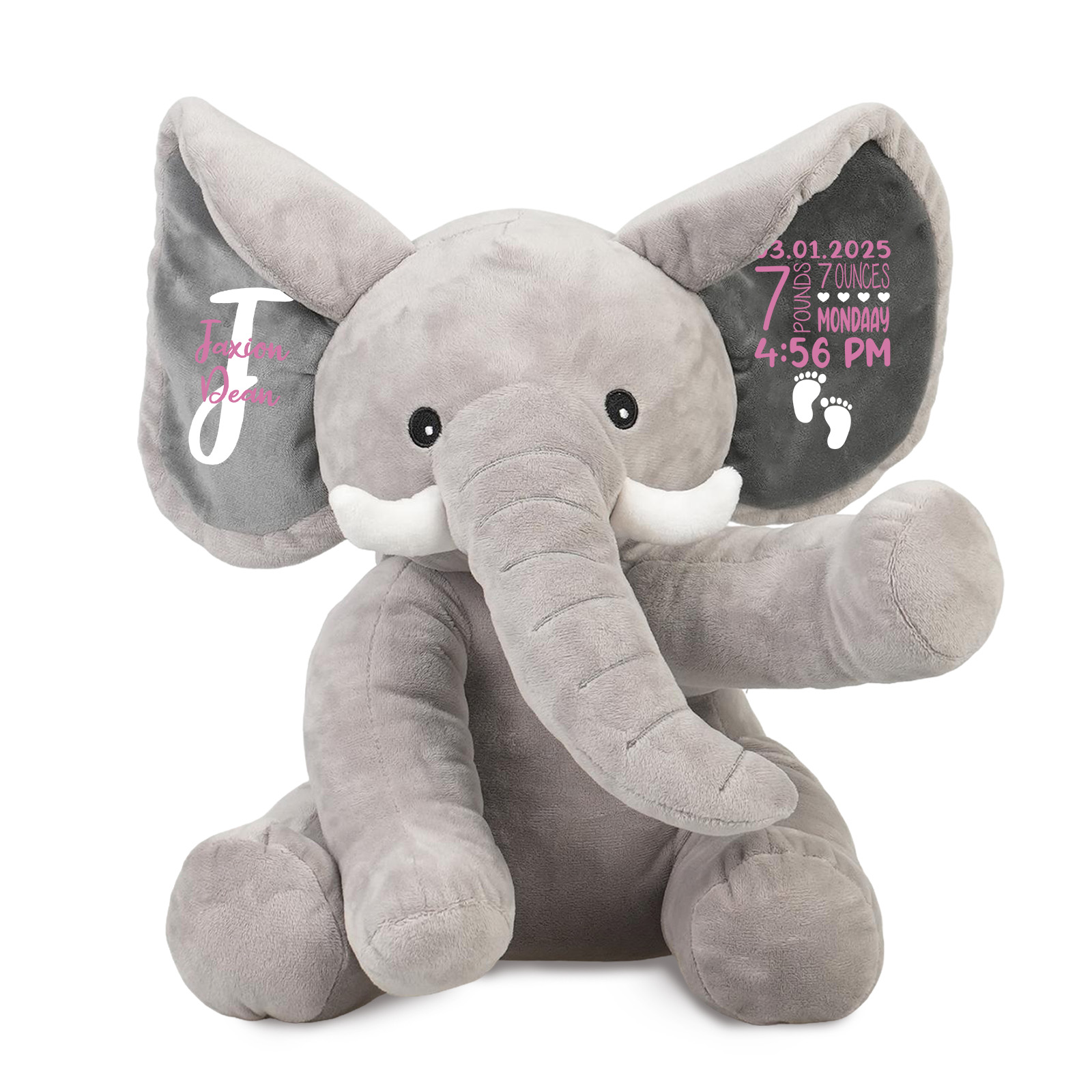 Celebrate your baby's arrival with this adorable elephant, personalized with their name, initials, birth date, time, weight, and length on its ear. A sweet reminder of their first moment, filled with love to cherish for years to come.
