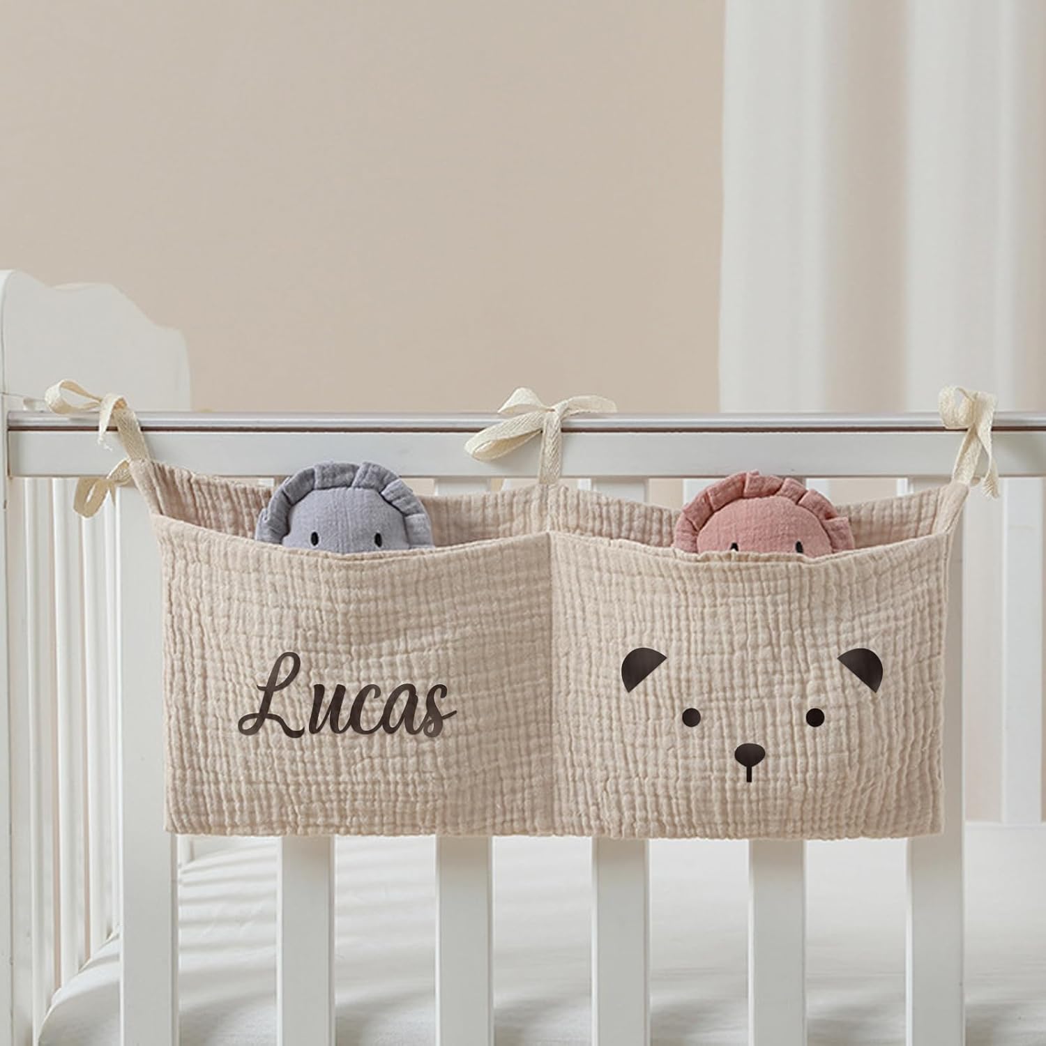- 【Convenient Storage Solution】Featuring 2 spacious pockets, this hanging bag offers ample space to organize and store baby essentials such as toys, diapers, wipes, and other necessities. It helps keep the nursery tidy and items easily accessible. It is equipped with sturdy straps for easy hanging.