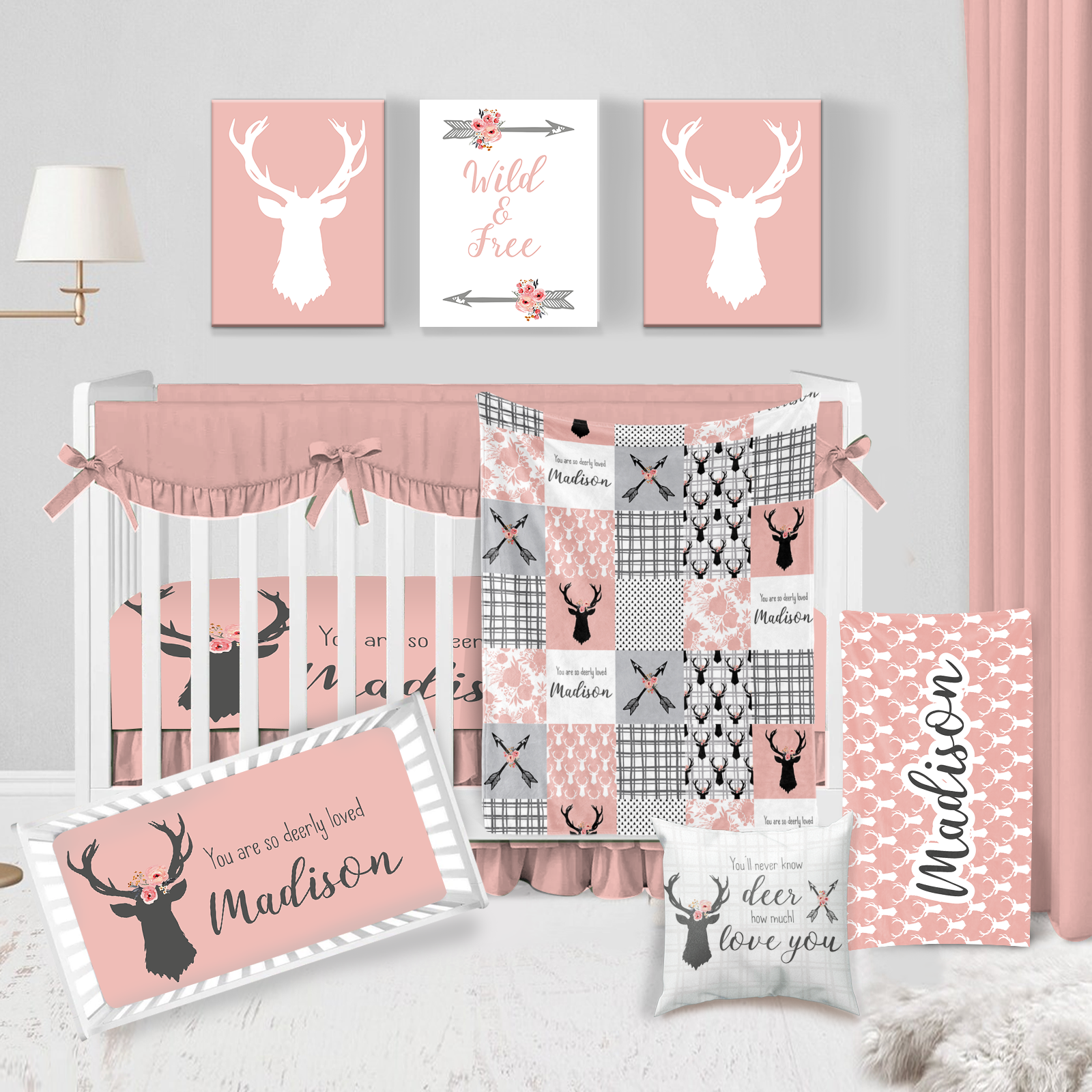 Baby Crib Bedding Set, Country - style with Deer Head and Patchwork Patterns, Personalized Name | BS2303