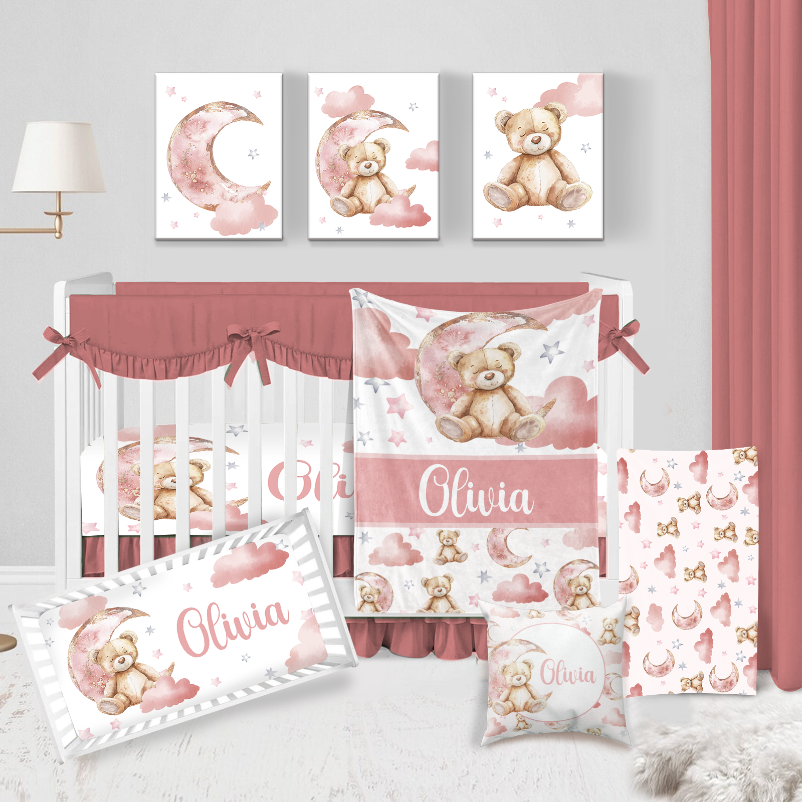 Teddy's Moonlit Slumber Party Custom Name Crib Bedding Set | BS2348
