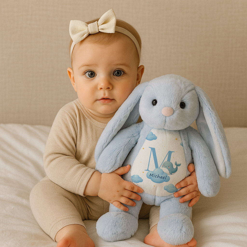 • Custom Bunny Plush – Personalize your gift with your choice of font, color, and a cute icon to make it truly one of a kind. The high-quality print is durable and securely stitched, so it stays beautiful even through all your baby's play and snuggles.