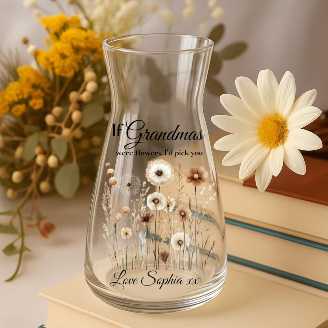 Celebrate someone special with this beautifully Personalised Glass Vase, designed to hold both flowers and heartfelt memories. Whether it’s for Mums, Nans, Grandmas, Nannies, Teachers, Friends, or Childminders, this vase makes a cherished keepsake for any occasion.