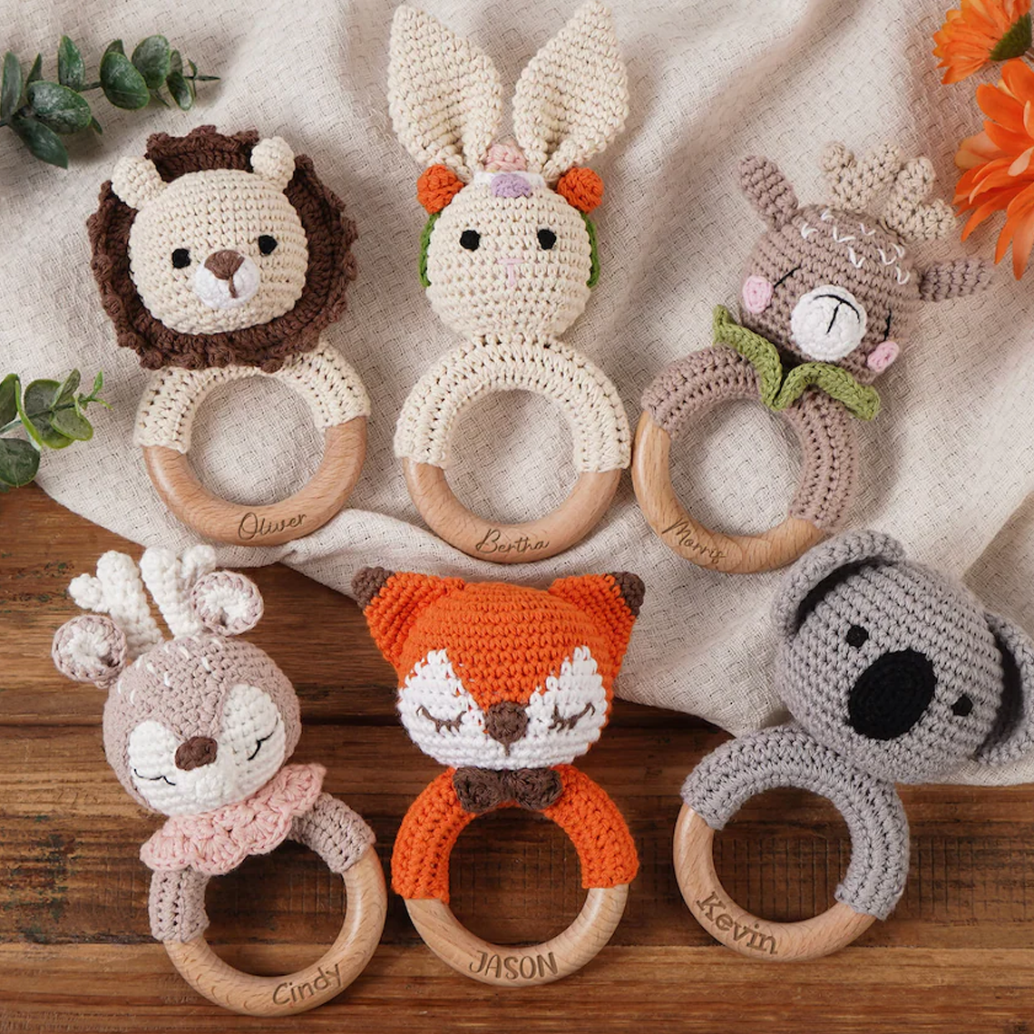 Personalized Animal Crochet Rattle,Custom Wooden Baby Rattle,Engraved Crochet Toy Rattle With Name For Baby,Baby Shower Gift,Newborn Gift