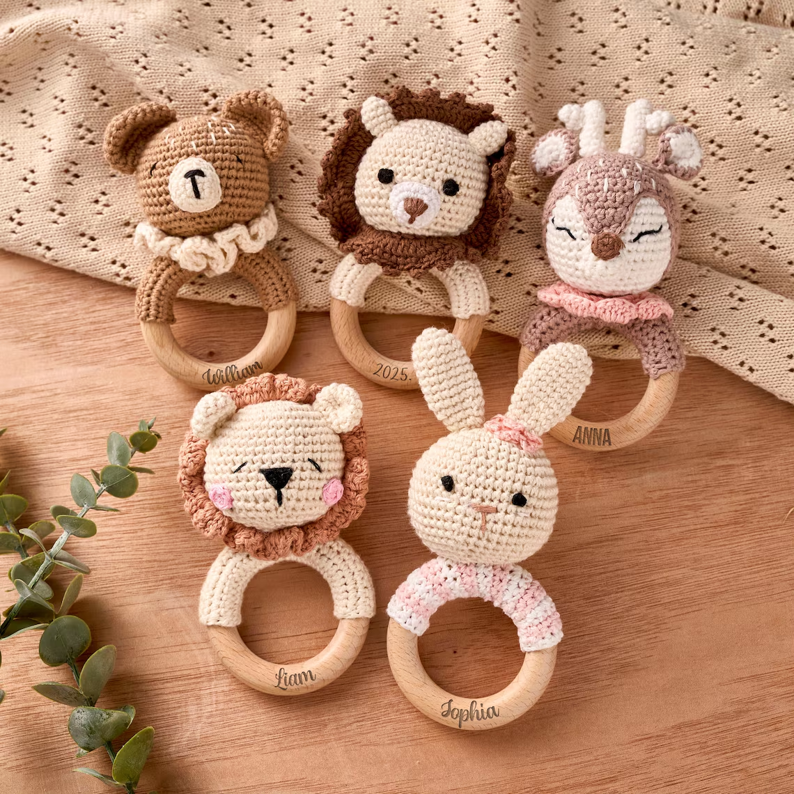 Personalized Animal Crochet Rattle,Custom Wooden Baby Rattle,Engraved Crochet Toy Rattle With Name For Baby,Baby Shower Gift,Newborn Gift For Baby Frist Christams