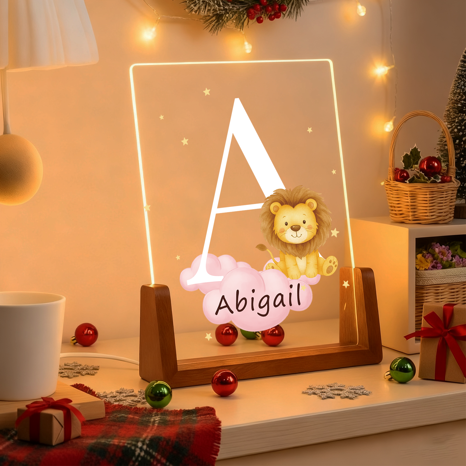 Personalized Cute Forest Animal Acrylic Cloud Star LED Night Light with Wooden Base Name and Initial Birthday Children's Day Gift for Boys Girls Baby Room Night Light Chirtmas Gift