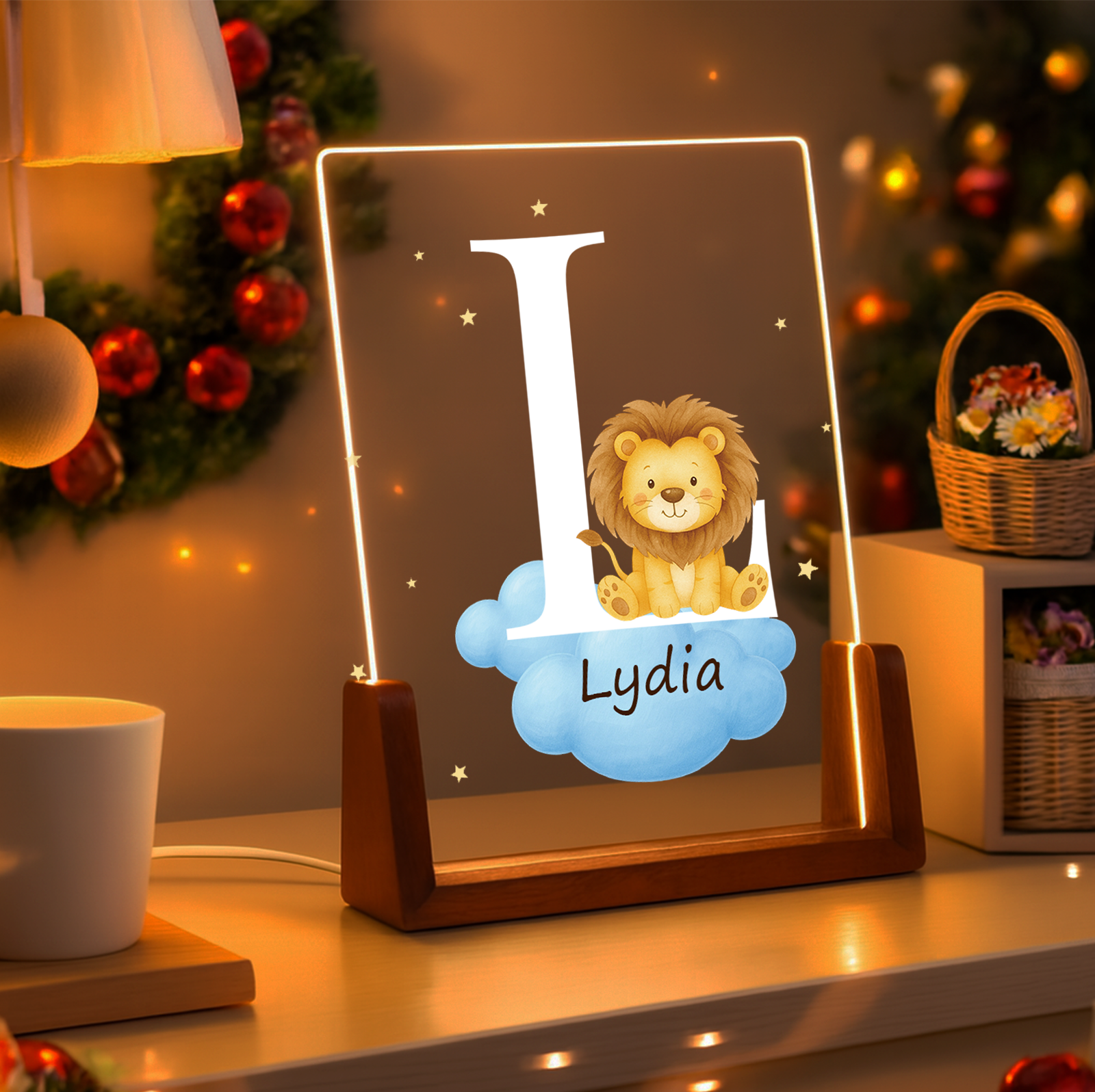 Personalized Cute Forest Animal Acrylic Cloud Star LED Night Light with Wooden Base Name and Initial Birthday Children's Day Gift for Boys Girls Baby Room Night Light Chirtmas Gift