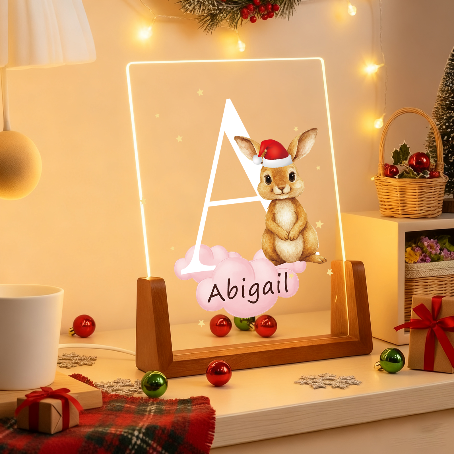 Personalized Cute Forest Animal Acrylic Cloud Star LED Night Light with Wooden Base Name and Initial Birthday Children's Day Gift for Boys Girls Baby Room Night Light Chirtmas Gift