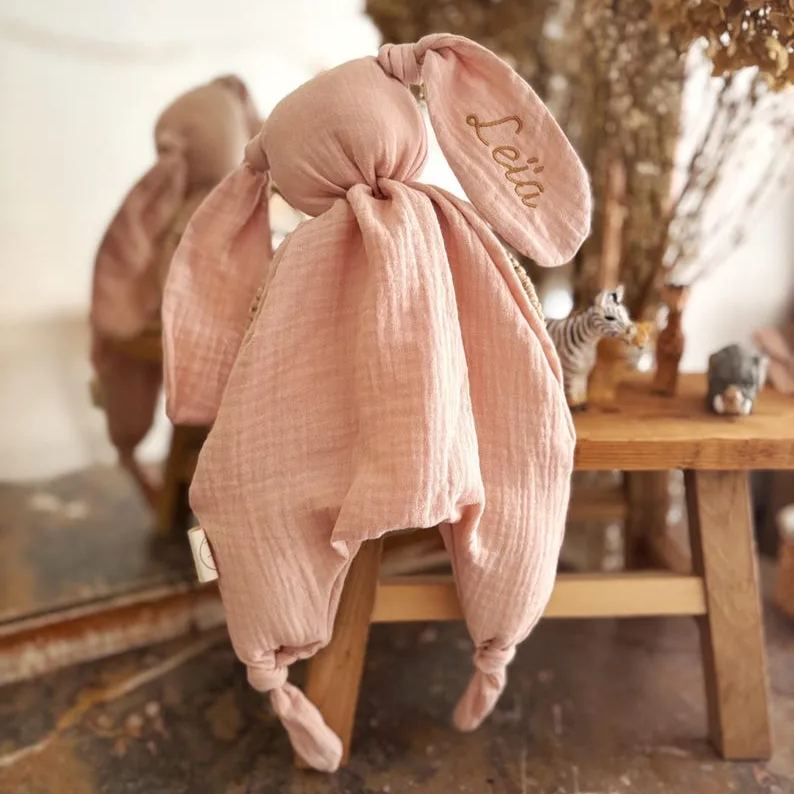 This comforter will accompany baby from birth with soft and natural materials. The pacifier can be attached to one of the rabbit's knots. The knotted ends are perfect for baby's little hands to easily manipulate.