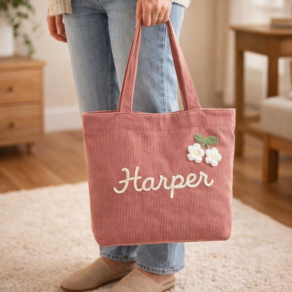 Personalized Corduroy Tote Bag for Women, Custom Name Large Shoulder Bag with Zipper, 3D Crochet Flower Embellishment, Stylish Travel College Work Handbag