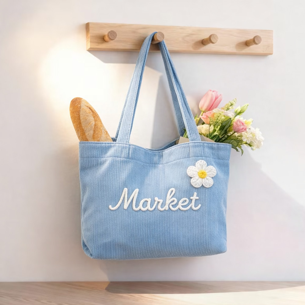Personalized Corduroy Tote Bag with Custom Name, Large Zipper Shoulder Bag with 3D Crochet Flowers