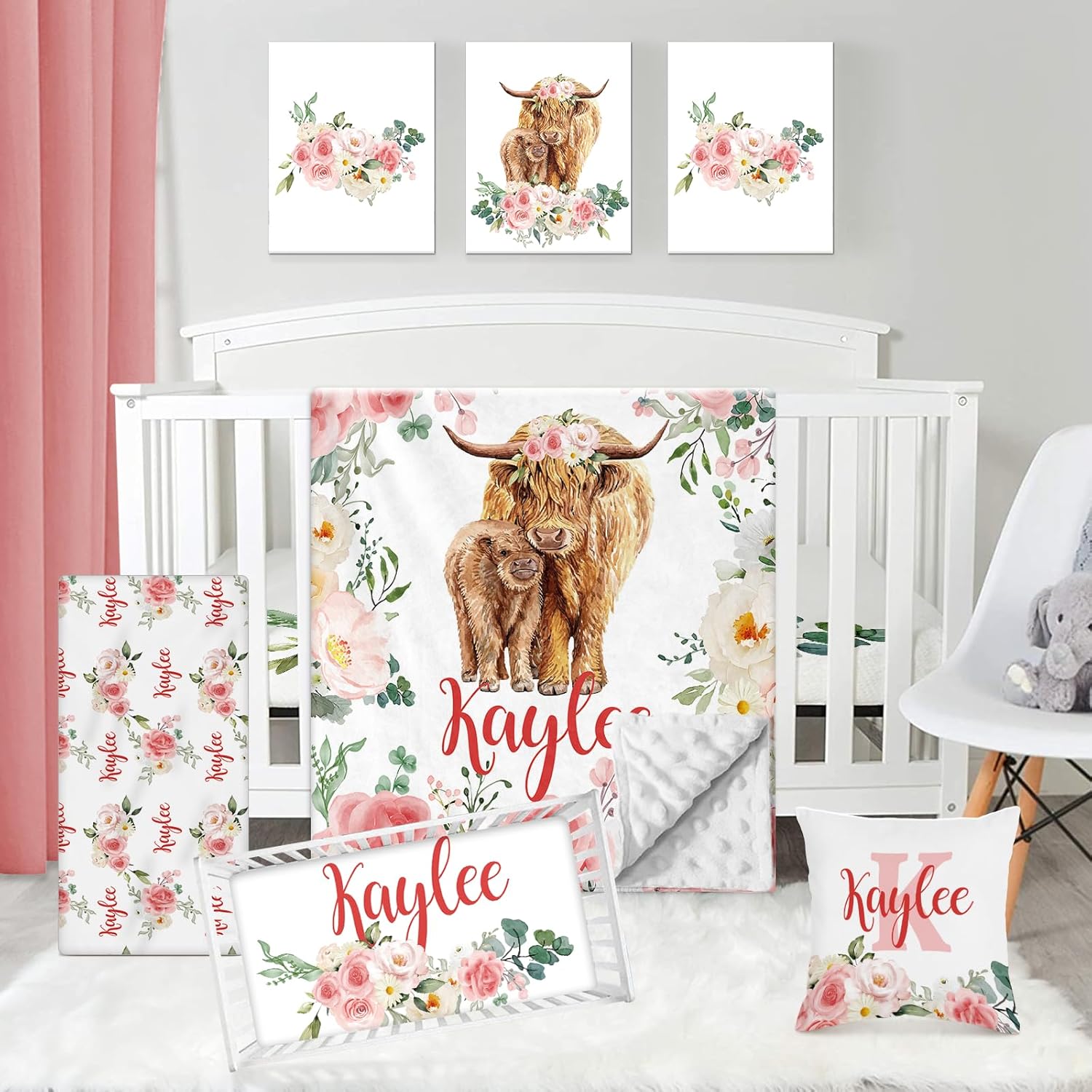 Personalized 5 Piece Baby Crib Sets, Custom Name Blanket with Dotted Backing for Baby Boys Girls, Highland Cow Bedding Set | BS108
