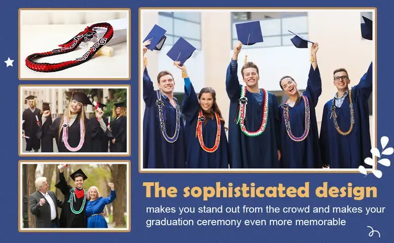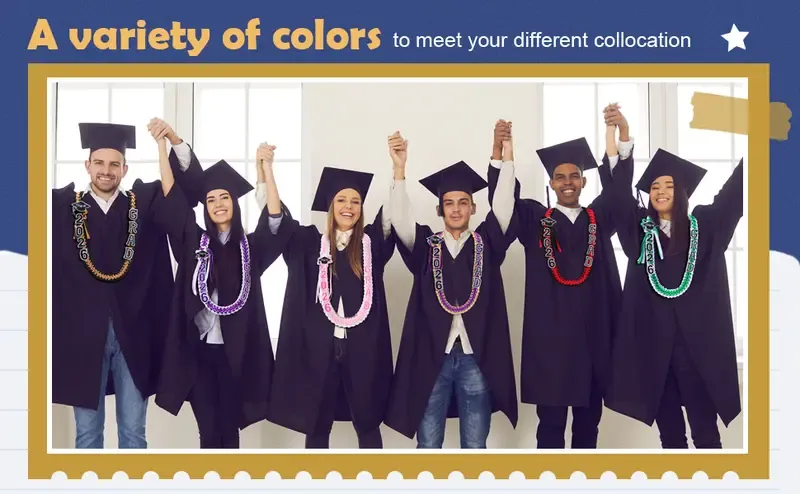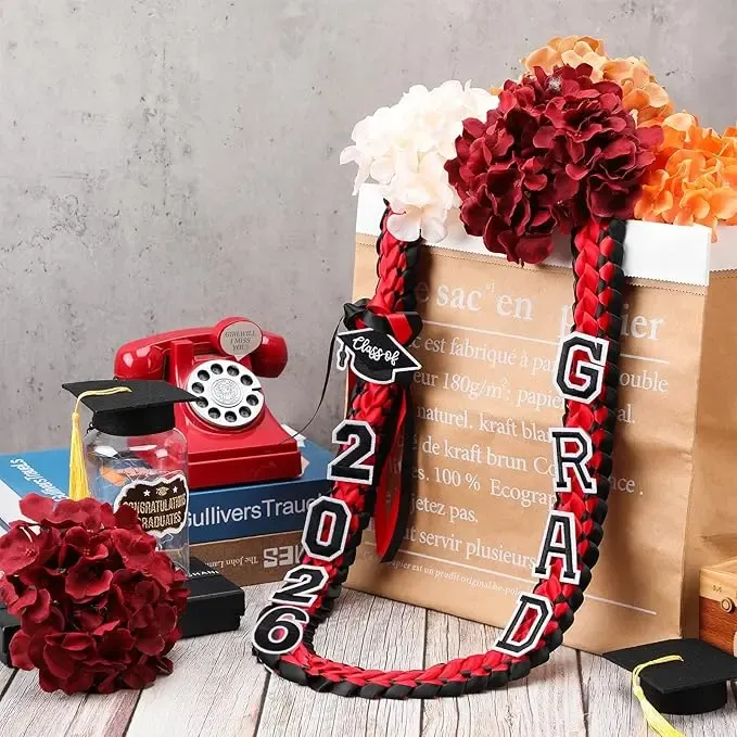 Celebrate your achievement with the Graduation Leis Class of 2026. Choose from 9 styles, including 2026 in various color combinations. Styles include Blue, White, Red, Black, Dark Blue, Gold, Green, Pink, and Floral Pink. Each package includes graduation rope and patches with pins. Made from polyester, ensuring a smooth and comfortable wear.