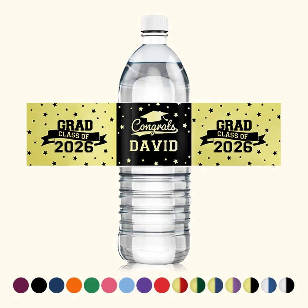 Make your graduation party extra special with these personalized Class of 2026 water bottle labels. Designed to add a unique touch to your celebration, each label can be customized with the graduate’s name and graduation year, turning ordinary water bottles into memorable party decorations.