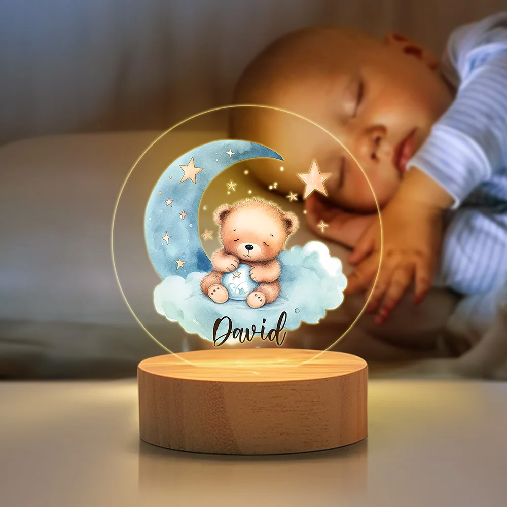 Personalized Moon Star Teddy Bear Acrylic LED Night Light with Wooden Base and Name Home Decoration Baby Shower Birthday Gift for Boys Girls