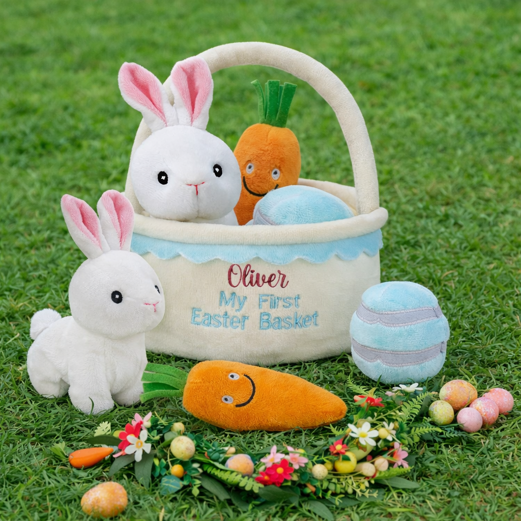 SUPER VALUE SET: The playset includes a stuffed bunny toy, an Easter egg toys, a carrot toy and a soft plush basket embroidered with "My First Easter" and Your