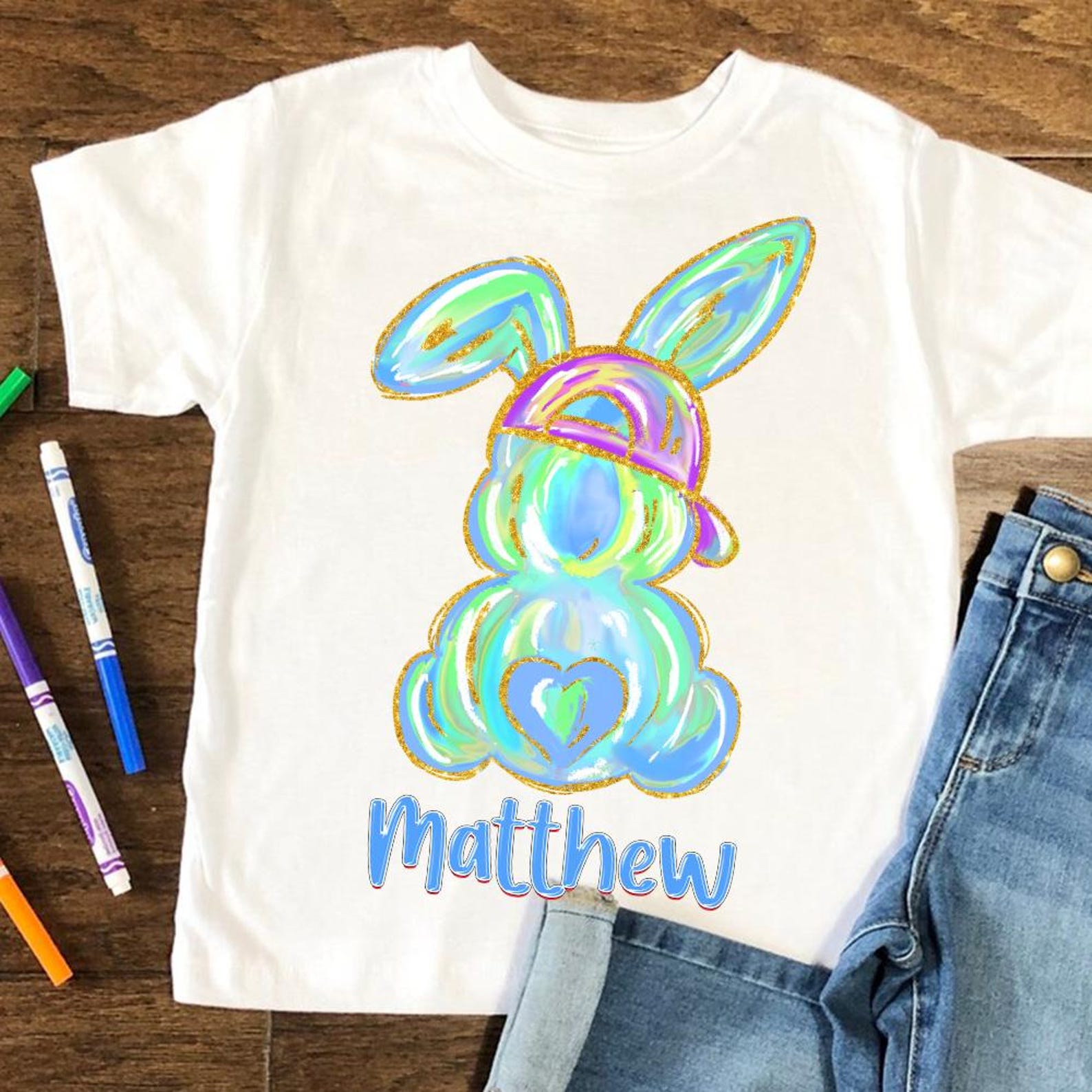 🎁Celebrate Easter in style with these adorable Easter Shirts featuring an Easter Bunny and your child's name. Perfect to wear on Easter Weekend while hunting