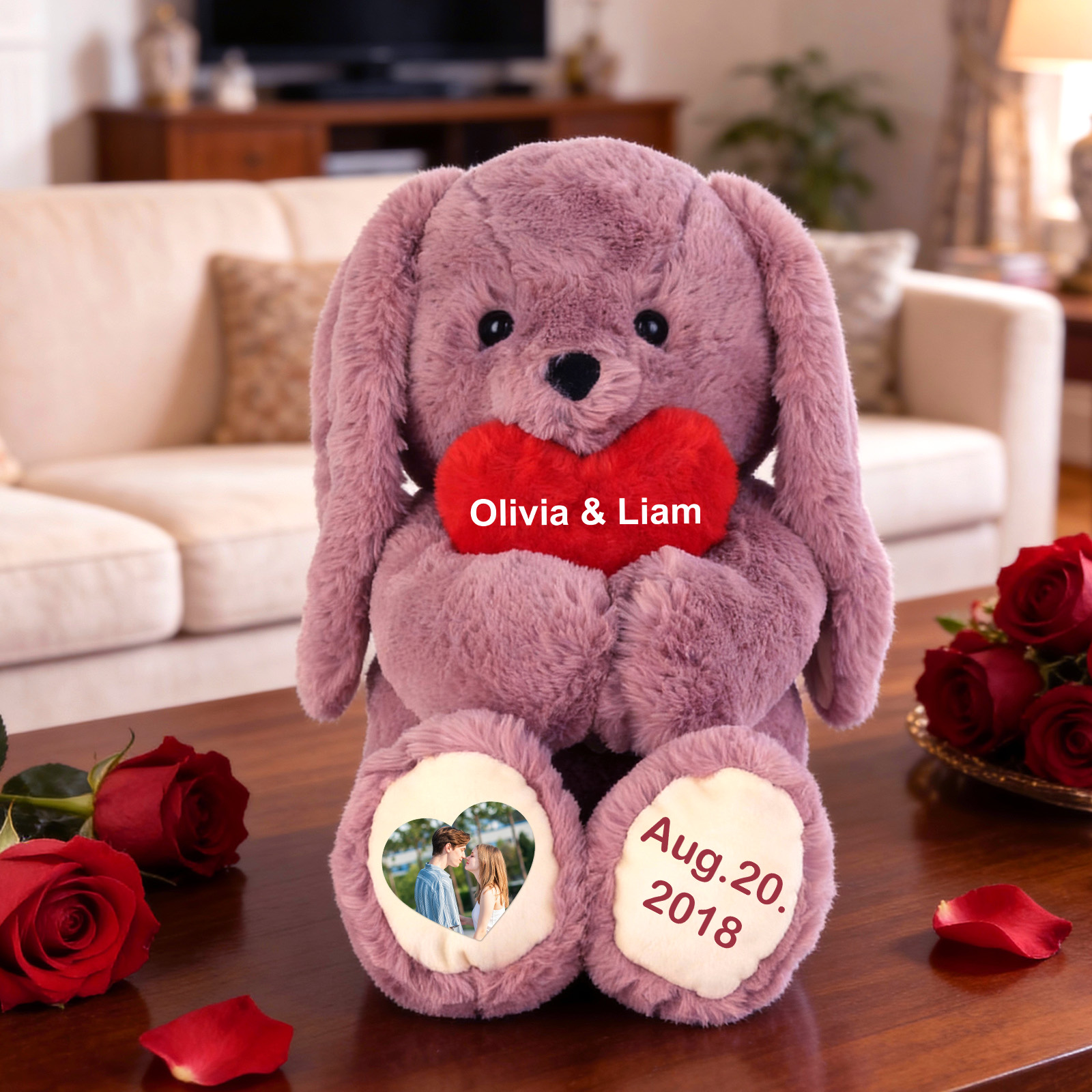 Perfect for anniversaries, birthdays, Valentine’s Day, memorial keepsakes, or just because, this custom plush bunny makes an emotional and thoughtful gift for couples, family members, or children. Its cuddly size and gentle texture make it ideal for display on a bed or shelf, or for everyday hugs that bring comfort and joy.