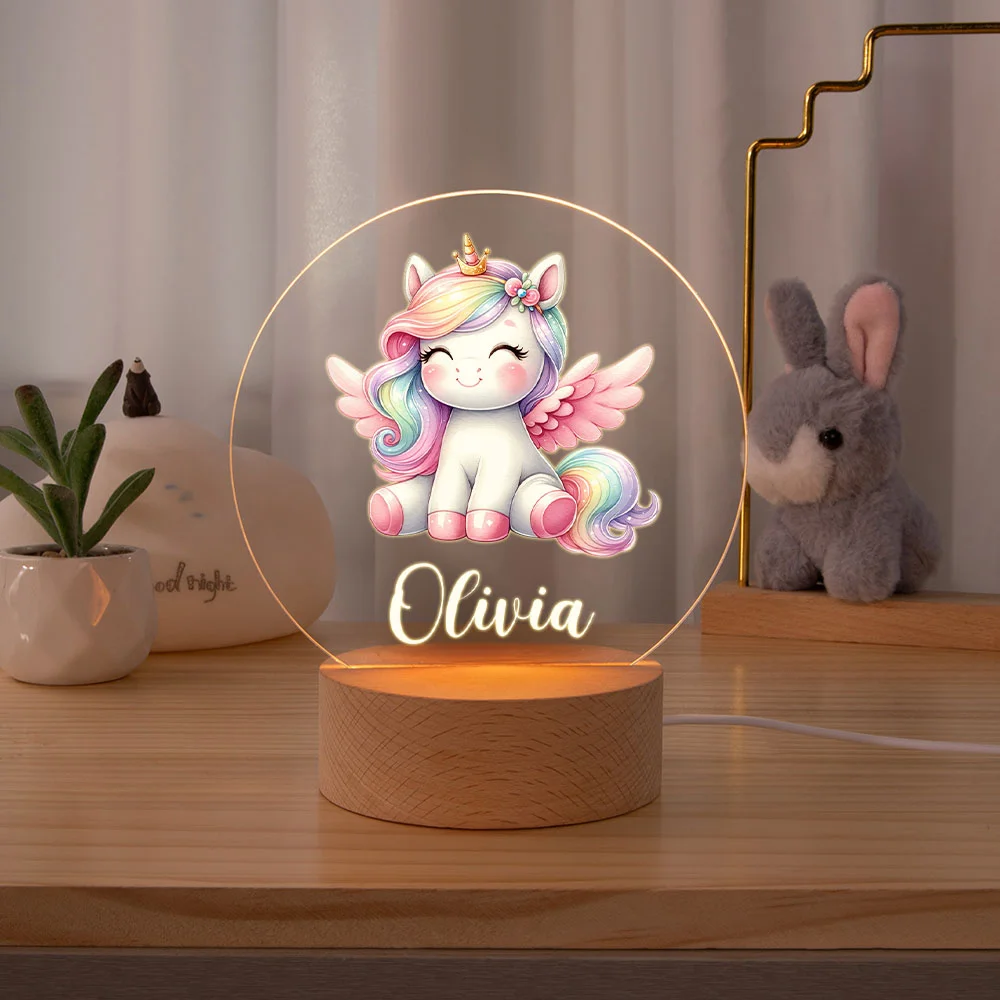 Personalized Rainbow Floral Fantasy Unicorn LED Night Light with Wooden Base and Name Nursery Kid Room Decor Birthday Baby Shower Gift for Girls