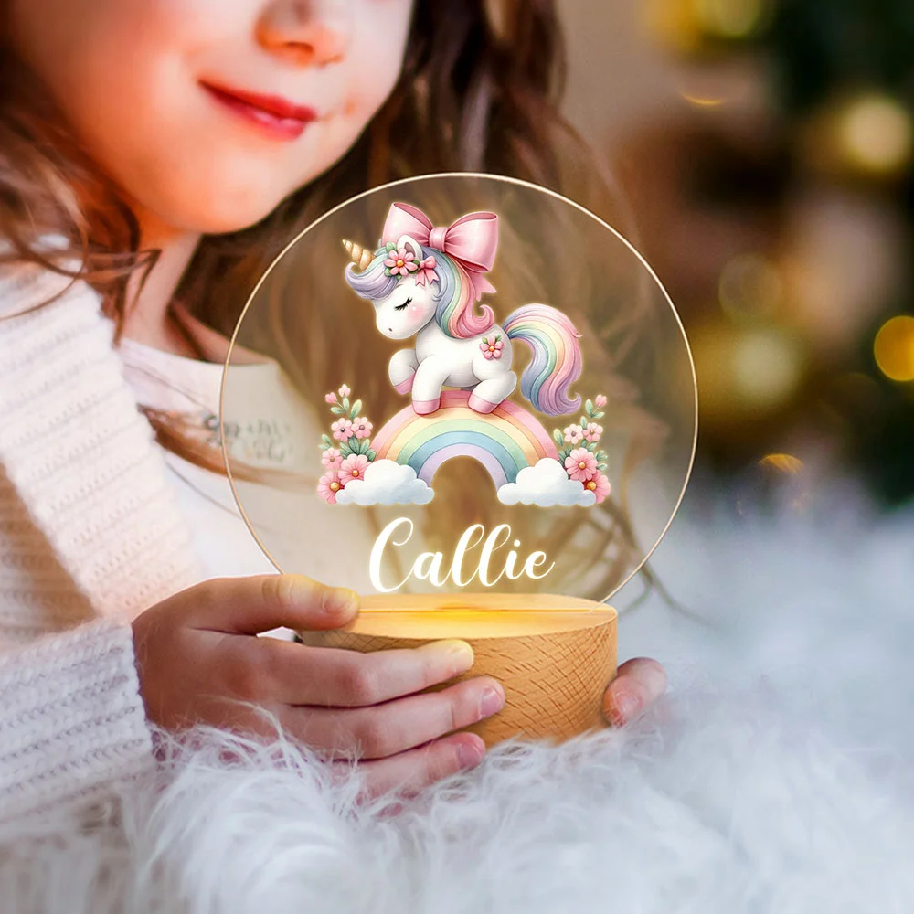 Personalized Rainbow Floral Fantasy Unicorn LED Night Light with Wooden Base and Name Nursery Kid Room Decor Birthday Baby Shower Gift for Girls