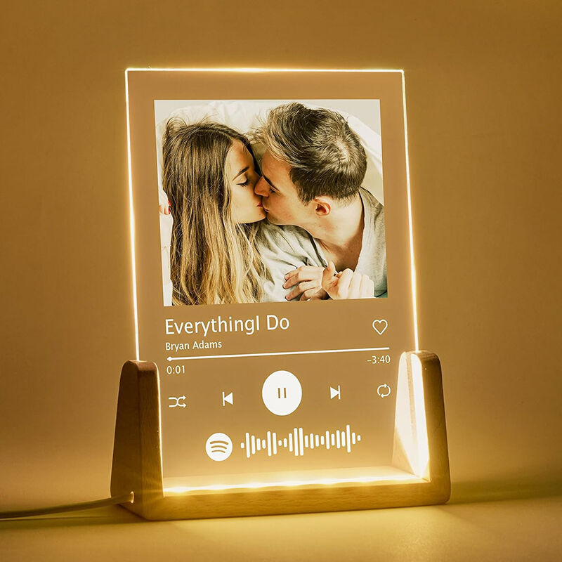 Introducing our unique night light, a perfect blend of acrylic and wood for a chic design. The soft glow, thanks to the acrylic's transparency and light diffusion, creates a warm and tranquil atmosphere. Personalize it with your favorite photo for added uniqueness.
