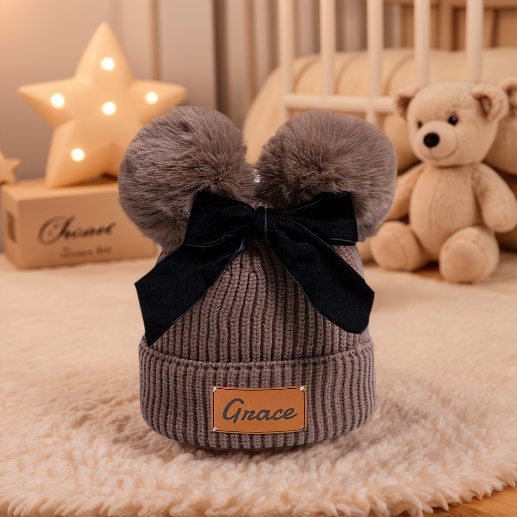 With the option to add your child's name or initials to the leather patch, this beanie becomes more than just a winter hat—it's a cherished keepsake that captures a unique touch of their early years. The soft bow and pom pom details give it an adorable flair that stands out in family photos, making each wear a picture-perfect moment.
