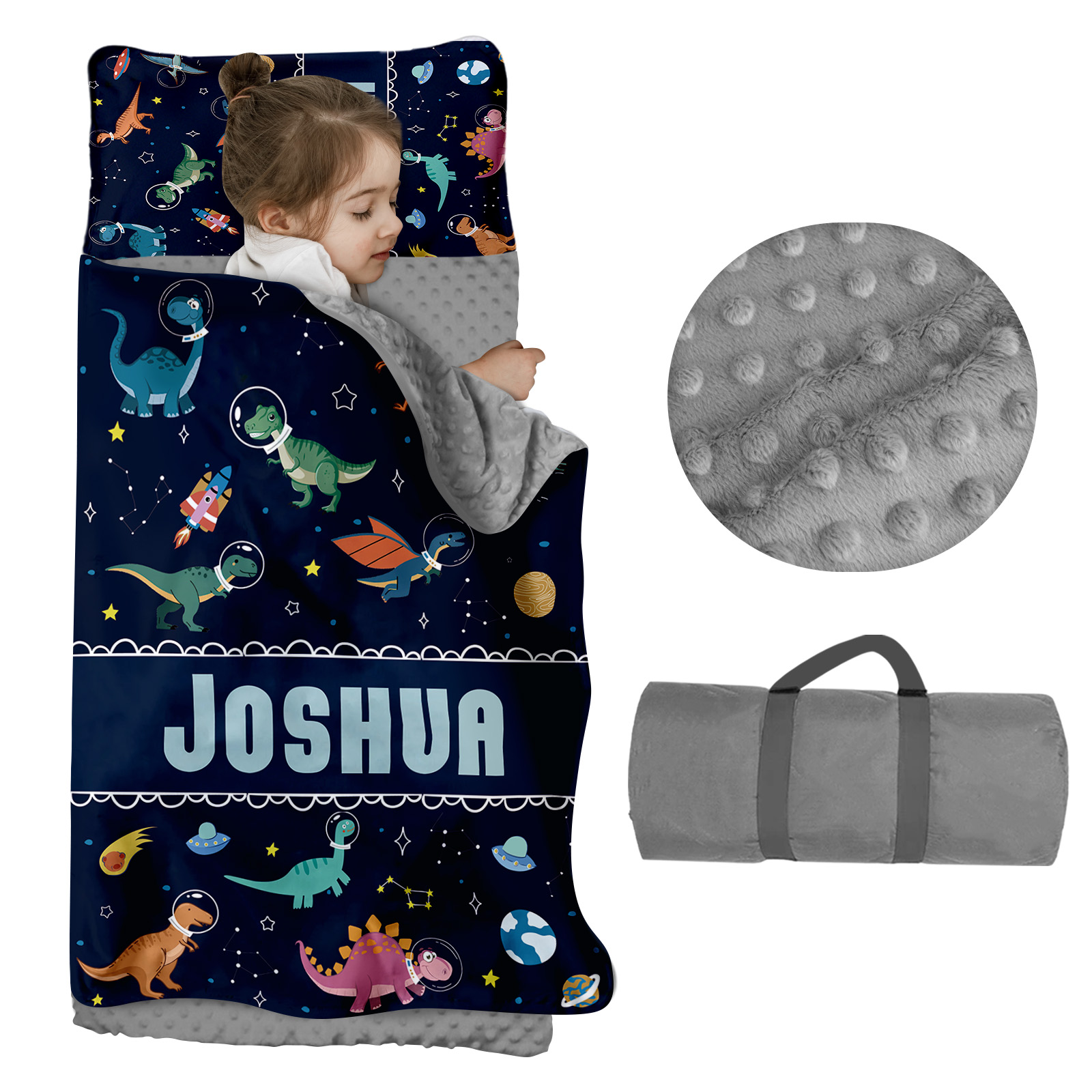 - 🌟 Personalized Dinosaur Theme: Transform naptime into a fun and personalized experience with our custom dinosaur nap mat, complete with your child's name. There are exclusive dinosaur themes for boys and girls that give your child a playful and unique vibe.