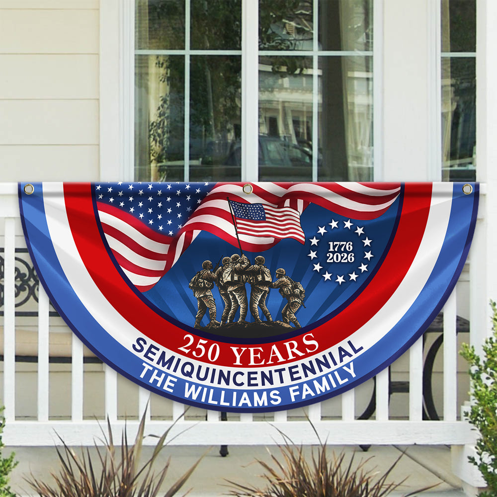 Celebrate America's historic milestone with this striking 250th Anniversary Semiquincentennial flag. Featuring a bold, non-pleated fan design, this patriotic display piece captures the spirit of the nation's remarkable journey. Perfect for commemorating 2026 and beyond, it brings timeless American pride to any space. Whether you're honoring the past or looking ahead to the future, this distinctive flag serves as a powerful symbol of unity and heritage. Make your patriotic statement with a design that stands out from traditional flags.