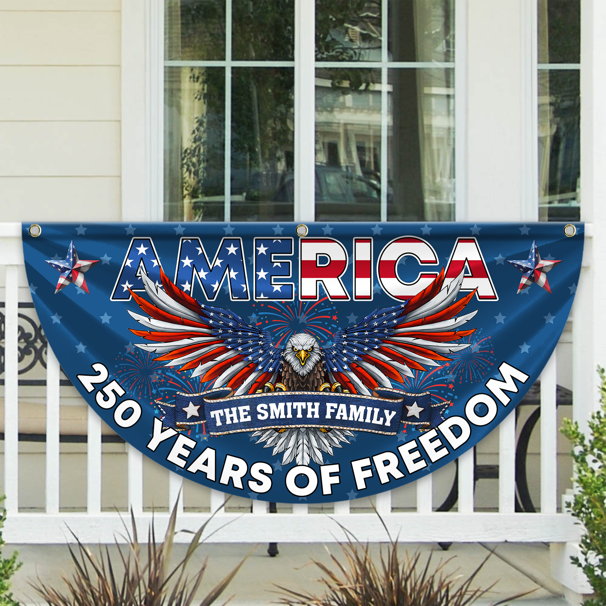 Celebrate your family's American heritage with this striking custom fan flag, designed to honor 250 years of freedom and independence. Personalize it with your family name to create a unique patriotic display that stands out. The non-pleated fan design offers a modern, dynamic look perfect for homes, patios, or patriotic gatherings. Crafted with quality materials, this flag combines meaningful personalization with bold American pride. Make a statement this year with a custom piece that reflects your family's values and love of country.